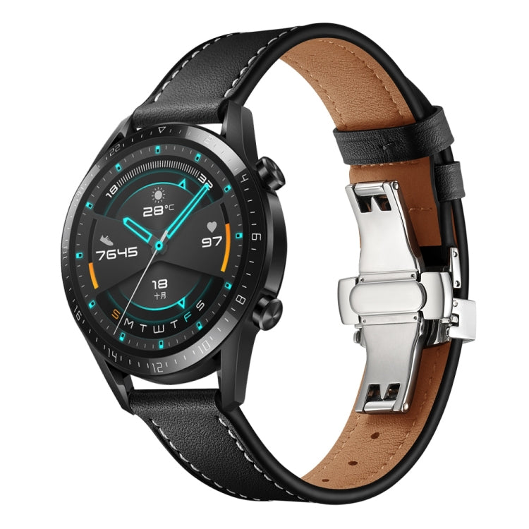 22mm Universal Butterfly Buckle Leather Watch Band, Style:Silver Buckle(Black)